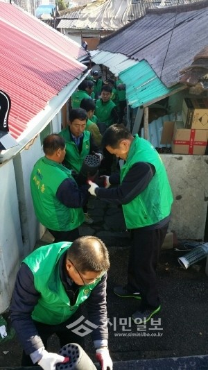 지난 1일 인천 강화군 강화읍 새마을 지도자협의회는 회원 15여명이 참여한 가운데 '행복에너지 나누기 운동'의 일환으로 강화읍내 저소득층 노인가구 3곳을 방문해 연탄 1200장을 나눠 주었다. 사진은 이날 행복에너지 나누기 운동에 참여한 회원들이 연탄을 나르고 있는 모습. (사진제공=강화군청)