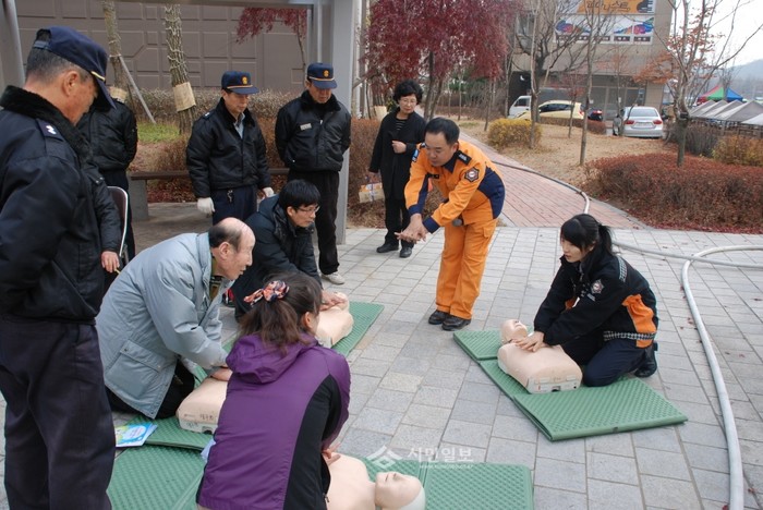 경기 양주소방서는 '2014 겨울철 소방안전대책 특수시책'의 일환으로 최근 광사동 휴먼시아 8단지 등 1000가구가 넘는 아파트 3개 단지를 방문해 관계자 및 입주민을 대상으로 '찾아가는 소소심 체험교육'을 실시했다. 사진은 심폐소생술을 교육받고 있는 아파트 경비원 및 주민들의 모습. (사진제공=양주소방서)