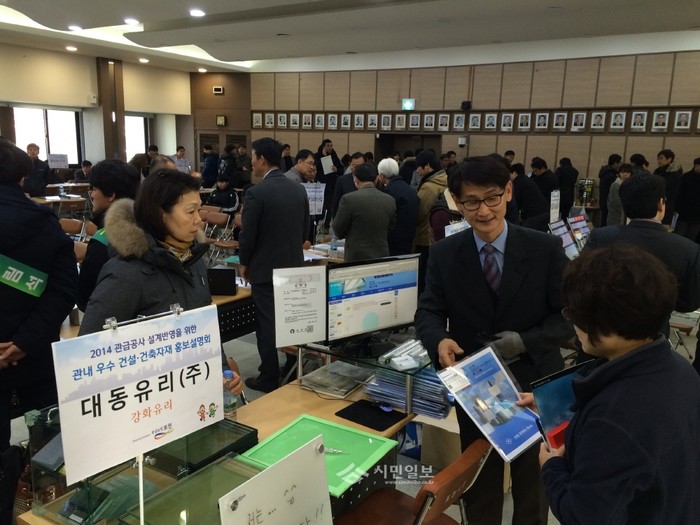 경기 포천시가 3일 대회의실에서 토목·건축·회계 담당자들과 지역내 건축·설계사무소 직원 등 약 100여명과 지역내 기업체 29개사가 참여한 ‘건설·건축자재 기업제품 설명회’를 개최했다. 사진은 제품설명을 하고 있는 기업 관계자의 모습. (사진제공=포천시청)