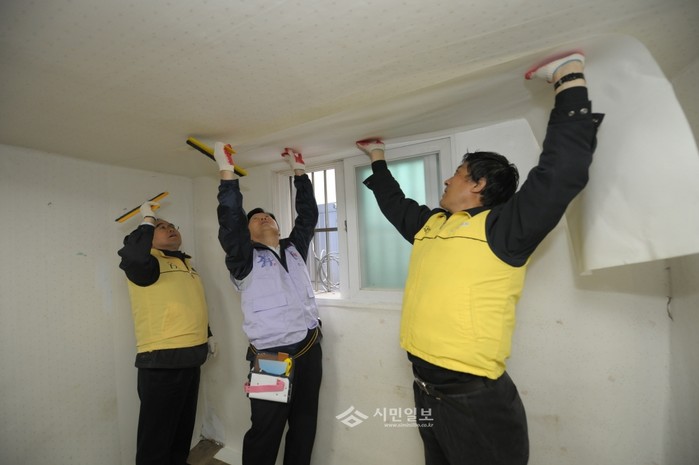 최근 최창식 서울 중구청장이 매서운 바람이 부는 추운 겨울을 나기가 힘든 저소득층 주민들을 위한 집수리 자원봉사로 (주)의종개발 집수리봉사대원 30명 및 그랜드 앰배서더 서울 호텔 직원들과 함께 중구 다산동에서 도배·페인트 작업을 실시했다. (사진제공=중구청)