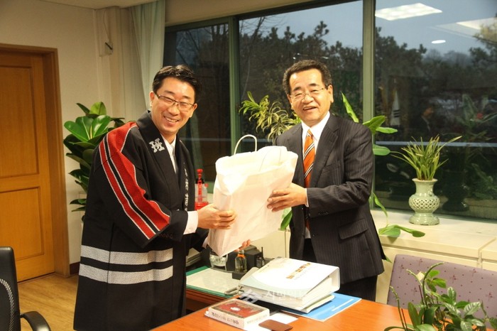 최근 일본 후쿠시마현 텐에이무라 의용소방단원 10명이 서울 동작소방서를 방문해 소회의실에서 서울소방의 활약상에 대한 영상을 시청하고 서순탁 소방서장과의 환담을 한 후 소방차량 체험을 했다. 사진은 텐에이무라 의용소방단 단장(오른쪽)이 선물한 의용소방대 옷을 착용하고 기념촬영 중인 서 서장의 모습. (사진제공=동작소방서)