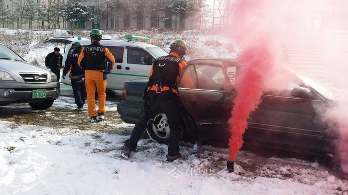 지난 3일 경기 오산시는 오산스포츠센터 뒤편(오산천 도로·공터)에서 화성동부경찰서, 오산소방서, 지역자율방재단과 함께 기습폭설 상황을 가정한 '2014 겨울철 폭설대응 교통소통대책 현장훈련'을 실시했다. 사진은 승용차가 미끄러져 차로를 막고 있는 상황을 가정해 훈련 중인 참가자들의 모습. (사진제공=오산시청)