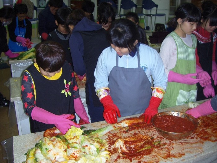 지난 3일 경북 구미시 인동초등학교는 학부모 학교참여 지원사업의 일환으로 1~6학년 희망학생과 학부모가 참석한 가운데 교내 실과 실습실에서 '김장 김치 담그기 체험행사'를 개최했다. 사진은 김장을 하고 있는 참가자들의 모습. (사진제공=구미교육지원청)