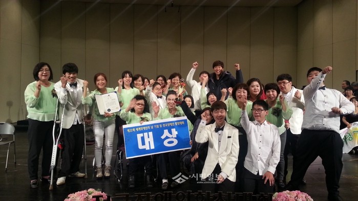 장애인과 비장애인들로 구성된 경기 용인시 '쿰 합창단'이 지난 3일 사단법인 국제장애인 문화교류협회 중앙회에서 주최한 '2014 전국 장애인합창대회'에서 대상(문화체육관광부 장관상)을 수상했다. 사진은 합창단원들이 기념촬영을 하고 있는 모습. (사진제공=용인시청)