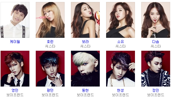 | ▲ 스타쉽엔터테인먼트 소속 가수 케이윌·씨스타(효린 소유 보라 다솜)·보이프렌드(영민 광민 동현 현성 정민 민우) 등 / 사진출처=네이버 캡쳐 | ||