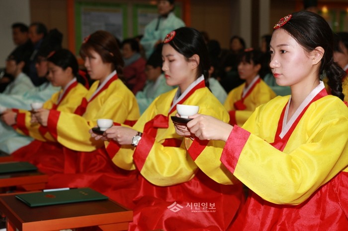 서울 강북구 21녹색삼각산공동체가 지난 4일 오전 11시 구청 대강당에서 수능을 마친 고3 학생 29명을 대상으로 '전통 성년례(계례)'를 열었다. 사진은 성년례가 진행되고 있는 모습. (사진제공=강북구청)