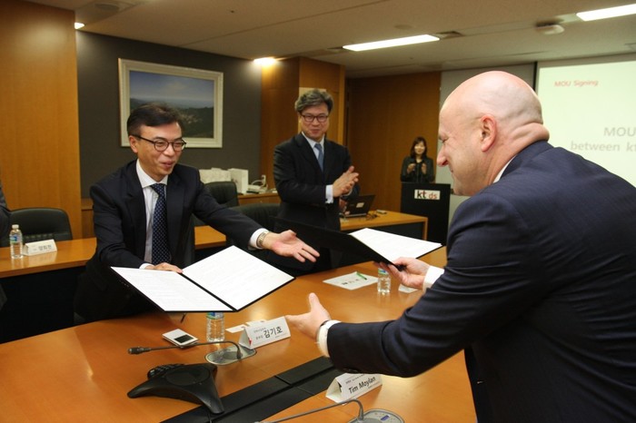 | ▲ KT DS와 Infor 대표자가 IT 매니지드(Managed) 서비스 시장 확대를 위한 양해각서를 교환하고 있다. (좌측 김기호 KT DS 전략사업본부장, 우측 팀모일란(Tim Moylan) Infor 아시아태평양지역 사장) | ||