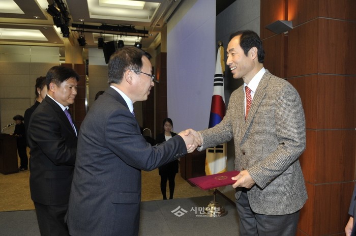 4일 문석진 서울 서대문구청장이 효창동 백범김구기념관 컨벤션홀에서 열린 '2014 복지행정상 시상식'에서 김원득 보건복지부 사회복지정책실장으로부터 '복지사각지대 발굴·지원' 부문 대상을 받고 있다. (사진제공=서대문구청)