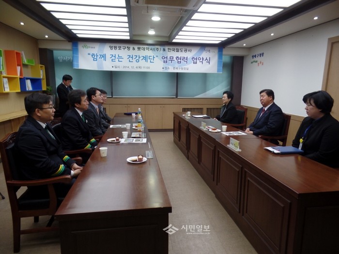 서울 수도권서부본부 영등포역이 4일 영등포구보건소·(주)롯데백화점과 함께 영등포역에 걸을 때마다 지역저소득층에 일정금액이 기부되는 건강계단을 설치하는 ‘함께 걷는 건강계단 조성사업’을 위한 업무협약(MOU)을 체결했다. 사진은 협약사항을 논의하고 있는 관계자들의 모습.(사진제공=영등포역)