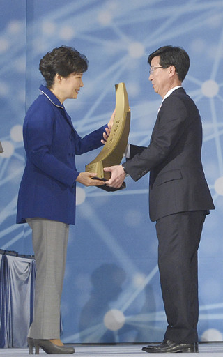 박근혜 대통령이 5일 오전 서울 강남구 영동대로 코엑스에서 열린 제51회 무역의 날 기념식에 참석, 유공자를 포상하며 박성욱 SK하이닉스 대표이사 사장에게 100억불 수출의 탑을 수여하고 있다.