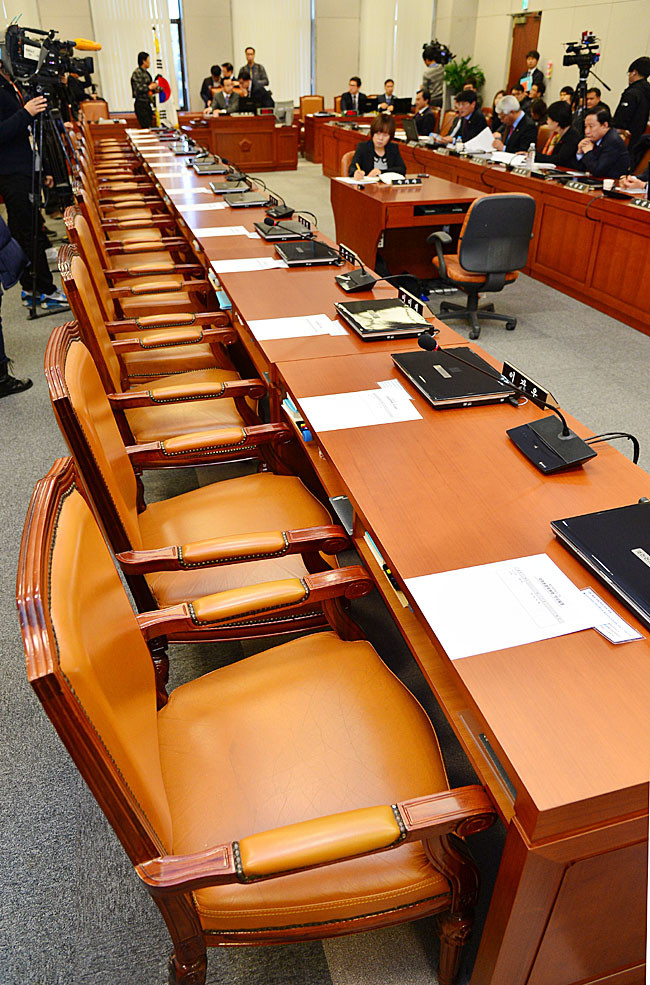5일 오전 서울 여의도 국회에서 열린 운영위원회 전체회의에서 새누리당 의원들이 불참해 빈 자리가 보이고 있다. 새정치민주연합은 청와대 비선실세들의 국정개입 의혹을 추궁하기 위해 국회 운영위 소집을 요청해 회의는 개의했지만, 새누리당 의원들은 이완구 위원장을 제외하고 불참했다.