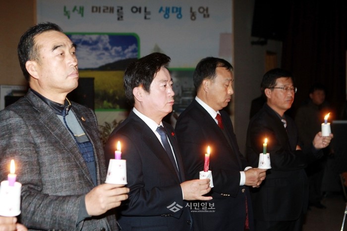 경기 용인시 용인그린대학동문회는 4일 농업기술센터 대강당에서 정찬민 시장을 비롯해 졸업생 등 130여명이 참석한 가운데 '역량강화 교육 및 송년 행사'를 개최했다. 사진은 동문이 함께 지역농업을 이끌어가는 선도자가 되자는 다짐의 의미로 촛불행사를 하고 있는 모습. (사진제공=용인시청)