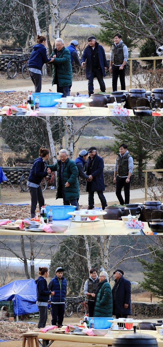 사진속에 등장한 <삼시세끼> 게스트는 이순재, 김영철이다. 이서진, 최지우, 손호준은 이순재를 반기며 반가움을 표시했다. 사진속의 이순재는 최지우의 손을 잡기도 했다.