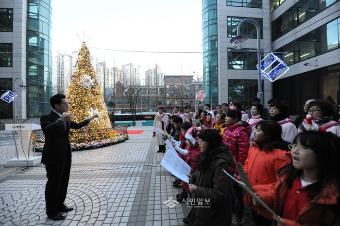 최근 중랑구는 구청 1층 광장에서 나진구 구청장을 비롯해 중랑구교구협의회 목사와 신도 중랑구 신우회원 등 100여명이 참여한 가운데 ‘크리스마스 트리 점등식’을 개최했다. 사진은 어린이들이 크리스마스 캐럴을 부르고 있는 모습. (사진제공=중랑구청)
