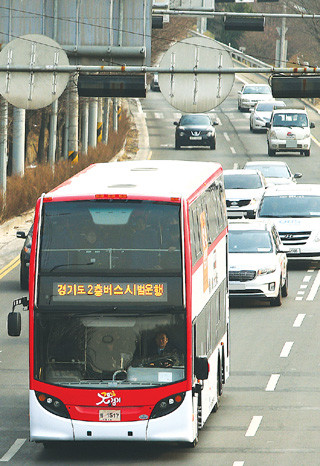 7일 오후 시승 행사를 위해 경기도 수원시 장안구 경기도인재개발원을 출발한 경기도 2층 버스가 서울 사당을 향해 1번 국도를 달리고 있다. 경기도는 광역버스 좌석제 안착을 위해 2층버스 도입을 검토 중이며 8일부터 3주 동안 실제 노선에 투입해 국내 적용 여부를 평가받을 방침이다.