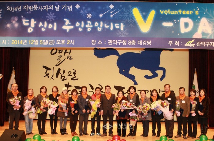 지난 5일 서울 관악구는 구청 강당에서 지역사회를 위해 헌신적으로 봉사한 주민, 단체 등을 격려하고 봉사자간 화합을 통한 나눔 실천을 확대하고자 자원봉사자 등 200여명이 참석한 가운데 ‘2014년 자원봉사자의 날’ 행사를 개최했다. 사진은 표창장 수여식 후 기념촬영 중인 유종필 구청장과 수상자들의 모습. (사진제공=관악구청)