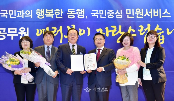 8일 열린 ‘제5회 2014 민원공무원의 날’ 행사에서 경기 수원시가 지난 4월부터 추진한 ‘안전 불빛 밝히기 사업'이 우수사례로 선정돼 민원행정개선분야 국무총리상을 수상하고, 관계자들이 기념촬영을 하고 있다. (사진제공=수원시)