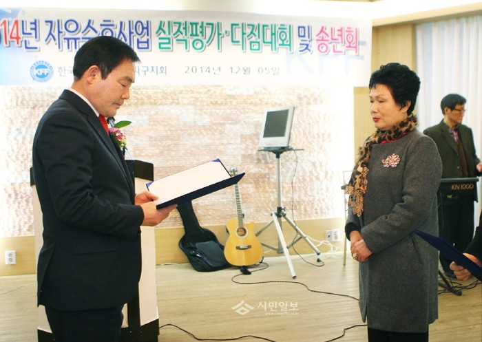 최근 가윤예식장에서 개최된 ‘2014년 자유수호 연말평가대회 및 다짐대회’에 참석한 임춘대 서울 송파구의장이 연맹발전에 크게 기여한 한국자유총연맹 송파구지회원들에게 송파구의회 의장상을 시상하고 있다. (사진제공=송파구의회)