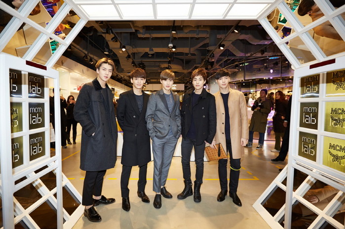 독일 럭셔리 브랜드 MCM이 5일 강남 코엑스 몰 <MCM LAB> 매장에서 플래그십 스토어 ‘MCM LAB’ 오픈 기념 파티행사를 연 가운데, 전속 모델인 엑소 세훈, 첸, 수호, 시우민, 첸, 레이가 참석하여 매장 입구에서 들어가기 전 인사를 하고 있다.