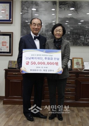 지난 5일 신연희 강남구청장(오른쪽)이 현정흥산(주) 신현국 회장으로부터 저소득층 주민지원사업을 위한 강남복지대한 후원금 5000만원을 전달받고 기념촬영을 하고 있다.(사진제공=강남구청)