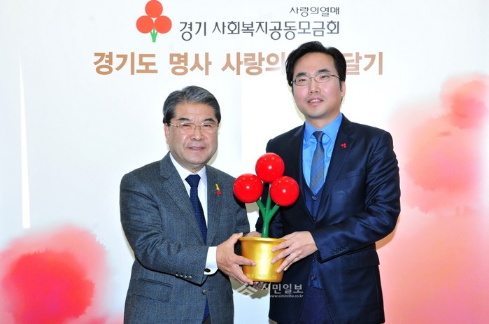 지난 8일 오전 교육감실에서 '2015 나눔 캠페인'의 일환으로 열린 '경기도 명사 사랑의 열매 달기 릴레이' 전달식에서 이재정 경기도교육감이 김효진 경기사회복지공동모금회 사무처장으로부터 사랑의 열매를 전달받은 모습.(사진제공=경기도교육청)