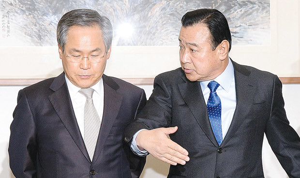 9일 오전 서울 여의도 국회 운영위원장실에서 열린 여야 원내대표 주례회동에 참석한 우윤근 새정치민주연합 원내대표(왼쪽)가 생각에 잠겨 있다.