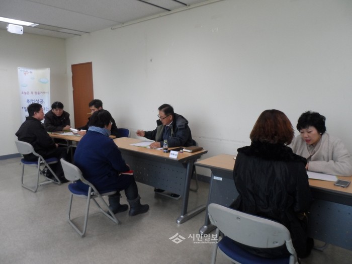 최근 서울 성동구 구청 소회의실에서 열린 구인·구직자들의 만남의 장인 ‘일 잡(Job)는 데이(Day)’에 참가한 4명의 기업면접관이 구직을 원하는 주민과 1대 1 면접을 보고 있다.(사진제공=성동구청)