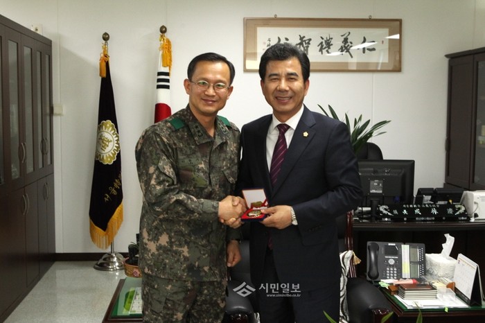 지난 8일 성임제 서울 강동구의회 의장 겸 서울시구의회의장협의회 회장이 육군 52사단장 김한기 소장을 포함한 군 관계자들과 만난 자리에서 연말연시를 대비한 국가 안보태세 강화를 당부하고 현안에 대한 대화를 나누는 시간을 보냈다. 사진은 성임제 의장(오른쪽)과 이한기 사단장(왼쪽)의 모습.(사진제공=강동구의회)