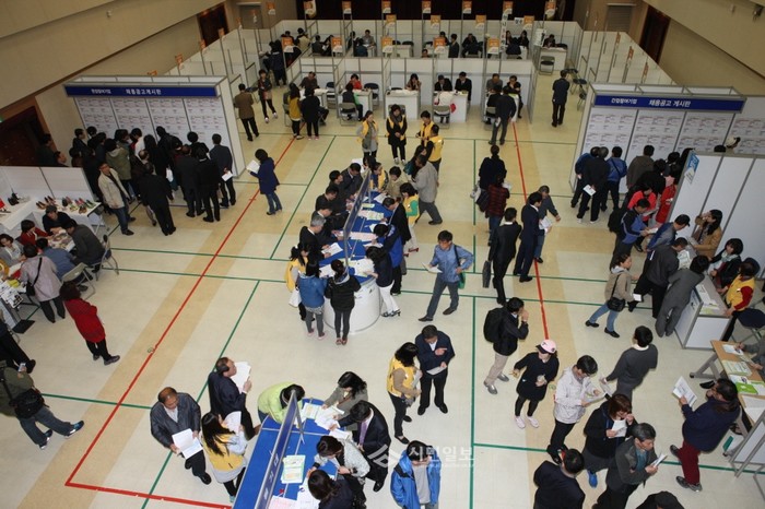 | ▲ 지난해 서울 성동구청 대강당에서 열린 '중장년 취업박람회 4060 희망일자리 한마당' 박람회에서 중장년층 구직자들이 박람회장을 돌아다니며, 1대 1 면접, 컨설팅 등의 구직활동을 펼치고 있다.(사진제공=성동구청) | ||
