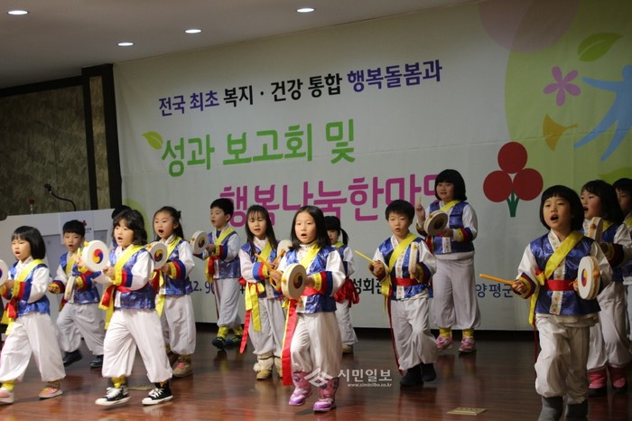 지난 9일 경기 양평군 행복돌봄과가 여성회관에서 올 한 해 추진해온 맞춤형 서비스의 추진성과를 보고하고 협력기관·단체 구성원들과 기부문화를 정착시키기 위한 '2014 성과보고회 및 행복나눔한마당'을 개최했다. 사진은 보고회에서 어린이들이 농악을 선보이는 모습. (사진제공=양평군청)