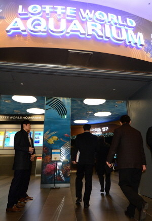 누수 현상이 발생한 서울 송파구 잠실 제2롯데월드 아쿠아리움에 국민안전처 관계자들이 10일 오전 현장 점검을 하기 위해 들어서고 있다. 제2롯데월드는 개장한 지 두 달도 되지 않아 '바닥 균열 논란', '금속물 낙하 사고' 등이 일어나며 안전성 논란이 이어지고 있다.