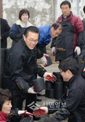 지난 10일 인천 연수구 옥련2동 옥골마을에서 옥련중앙교회가 후원한 연탄 2100장을 지역내 홀몸노인 등 경제적으로 어려운 가구에 전달하는 '사랑의 연탄 나눔 행사'가 열려 이재호 연수구청장 외 30여명의 봉사자들이 참여했다. 사진은 연탄을 나르는 이재호 구청장(왼쪽)과 봉사자들의 모습.(사진제공=연수구청)