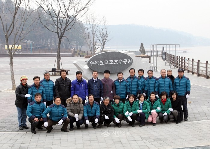지난 10일 경기 포천시 소흘읍 수목원고모호수공원광장에서 원래 농업용 저수지였으나 둘레길 및 다목적축제광장 조성을 통해 공원으로 재탄생한 호수공원을 관람객들에게 적극적으로 홍보하기 위한 '수목원고모호수공원광장 조형물 제막식'이 열렸다. 사진은 제막식을 마친 후 기념촬영 한 관계자들의 모습.(사진제공=포천시청)