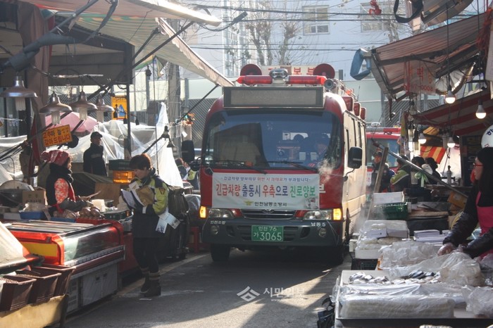 12일 인천 남동소방서는 화재가 발생했을 때 진압을 위한 소방차가 원활히 통행할 수 있도록 지역내 전통시장 중 한 곳인 만수시장에서 소방차량 3대, 소방공무원 등 30여명이 참여한 가운데 '출동로 확보 훈련'을 실시했다. 사진은 출동로 확보 훈련 중인 소방차 관계자들의 모습.(사진제공=남동소방서)