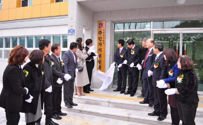 최근 경기 안성시 서운면에서 안성제4공단 공원내에 신축된 주민자치센터와 어린이집 개관식, 주민자치프로그램 발표회가 개최됐다. 사진은 주민자치센터·어린이집 개관식에 참석한 황은성 안성시장과 시·도의원 등 관계자들이 현판식을 진행하고 있는 모습. (사진제공=안성시청)