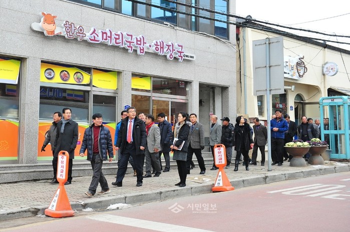 경기 여주시가 추진한 '능서면 소재지 아름다운 한글간판 개선사업'이 최근 마무리 된 가운데 능서면 간판개선 추진위원회와 지역상인들이 자발적으로 준공식을 개최했다. 사진은 이날 준공식에 참여해 거리를 둘러보는 원경희 여주시장 등 행사 참가자들의 모습. (사진제공=여주시청)