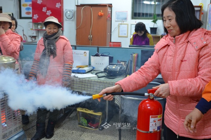 최근 서울 영등포소방서가 한국야쿠르트 신길점에서 항상 소화기를 휴대하고 다니다가 화재를 목격할 경우 즉각 초동진화에 나서 화재 피해를 줄이는 '골목길 소화기 이동 안전단' 발대식을 열었다. 사진은 안전단에 참여한 야쿠르트 아줌마가 소화기를 작동시키는 모습.(사진제공=영등포소방서)