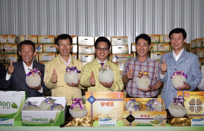 | ▲ 도포 멜론 현장을 방문한 전 군수(가운데)가 멜론을 들어보이고 있다.(사진제공=영암군청) | ||