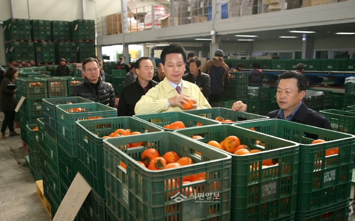 | ▲ 지난 11월 전동평 영암군수가 농업 경쟁력 강화를 위한 '금정 대봉감 선별작업 현장'에 방문한 모습.(사진제공=영암군청) | ||