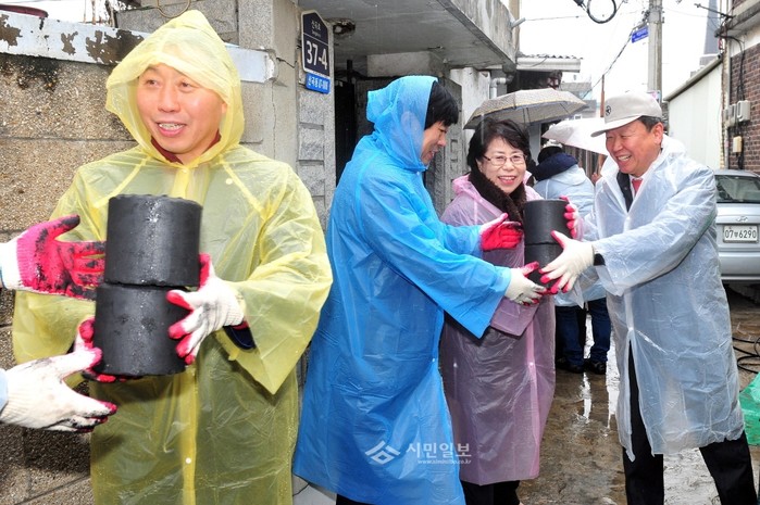 지난 15일 홍미영 인천 부평구청장(왼쪽에서 두번째)이 (사)부평구중소기업협의회 회원사 대표들과 함께 인천 부평구 산곡1동을 방문해 궂은 날씨에도 '지역사회 사랑실천 운동'의 일환으로 소외계층을 위해 연탄을 배달하는 등 '연탄나눔 봉사활동'을 펼치고 있다. (사진제공=부평구청)
