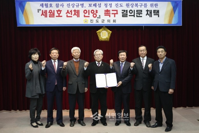 [진도=진용수 기자]전남 진도군의회가 지난 15일 제211회 정례회 제5차 본회의를 열고 세월호 참사로 인해 희생 당한 실종자의 완벽한 구조와 사건의 진상규명, 그리고 진도군을 비롯한 전남 서남권 어민들의 삶의 터전이었던 해역의 청정 이미지 원상 복구를 위해 세월호 선체를 조속히 인양할 것을 촉구하는 결의문을 채택했다.