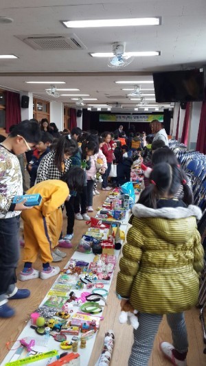 경북 구미시 송정초등학교 4층 강당에서 '학부모 학교 참여 지원 봉사활동' 사업의 일환으로 '송정 아나바다 알뜰바자회' 행사가 최근 열린 가운데 이날 행사에 참여한 아이들이 펼쳐놓은 물건을 살피고 있다.