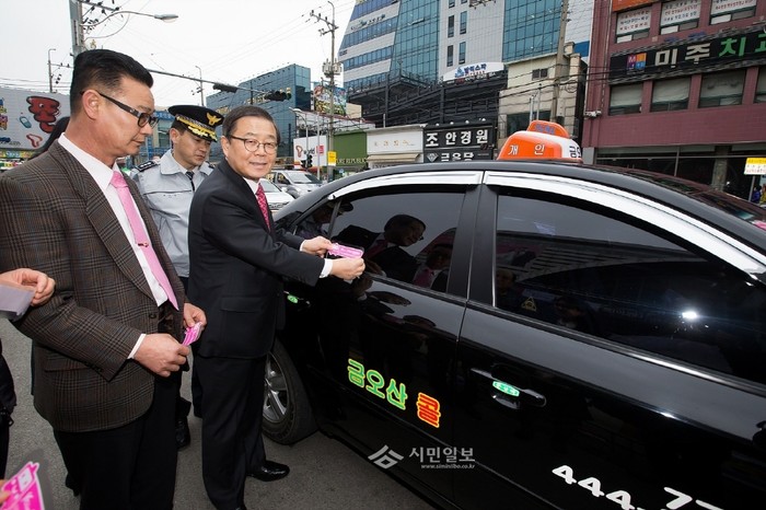 | ▲ 남유진 경북 구미시장이 시민들의 안전한 귀가를 위해 승객이 택시를 탄 시간과 위치, 택시정보를 보호자에게 문자메시지로 전송해주는 근거리무선통신(NFC)과 QR 코드가 설치된 차량에 안내 스티커를 부착하고 있다. | ||