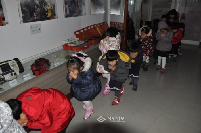 18일 인천 남부소방서가 어린이집 원생들을 대상으로 화재진압장비 견학, 화재발생시 대피방법 등을 익혀 화재시 대응능력을 키우기 위한 '어린이 소·소·심 체험교실'을 진행했다. 사진은 소방관의 지도에 따라 입과 코를 막고 대피훈련 중인 어린이들의 모습. (사진제공=남부소방서)
