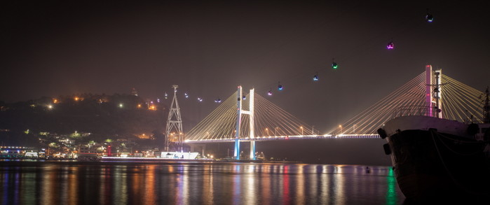 90m 높이에서 바다 위를 지나는 전남 여수해상케이블카의 그림 같은 야경모습. 케이블카를 운영하는 여수포마사는 18일 "아름다운 여수밤바다와 케이블카의 야경이 1000만 관광도시 여수의 핵심 관광콘텐츠로 떠오르고 있다"고 밝혔다.