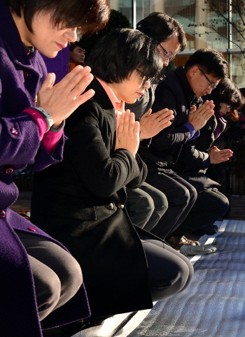 통합진보당 위헌정당해산심판 사건에 대한 선고를 하루 앞둔 18일 오후 서울 종로구 안국동 거리에서 이정희 대표를 비롯한 당원 및 관계자들이 정당해산반대 민주수호 대국민호소 108배를 하고 있다.