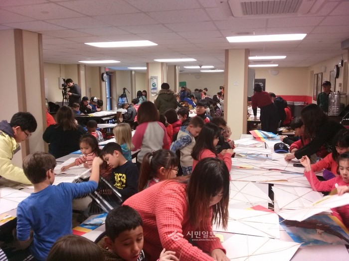 최근 동두천 평화포럼의 주최로 경기 동두천 사동초등학교 학생들이 미2사단에 위치한 Casey school 학생들과 공동 설치예술 작업을 통해 우정을 쌓고 평화통일과 세계평화를 기원하는 '평화의 연 만들기' 행사가 열렸다. 사진은 함께 연을 만드는 학생들의 모습.(사진제공=동두천시청)