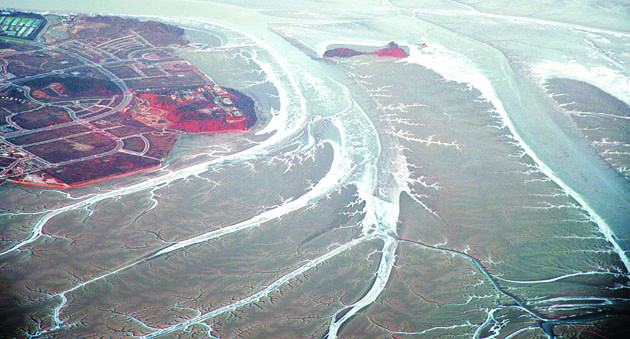 서울 영하 13도 등 한파가 절정을 보이고 있는 가운데 18일 김포발 여수행 아시아나항공에서 바라본 한강하구가 얼어붙어 추위를 실감케하고 있다