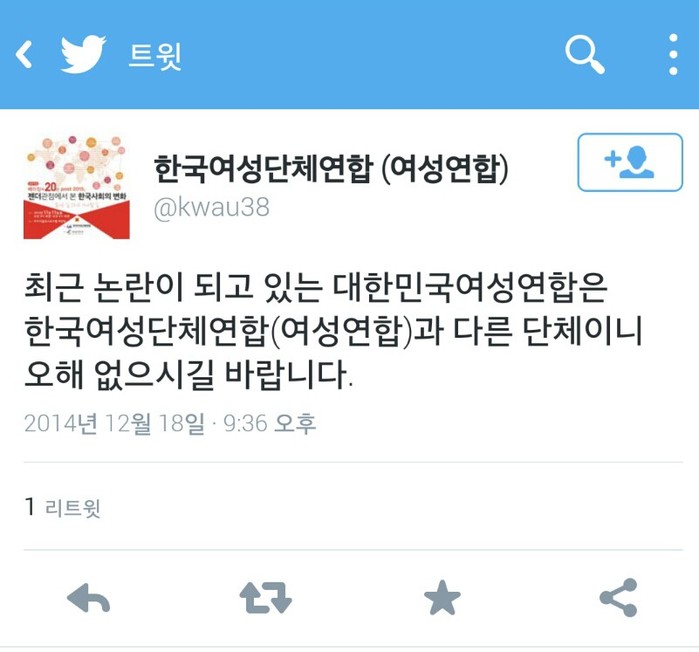이와 관련해 '한국여성단체연합'은 공식 트위터를 통해 "최근 논란이 되고 있는 대한민국여성연합은 한국여성단체연합(여성연합)과 다른 단체이니 오해 없으시길 바랍니다"고 공지를 올려둔 상태다.