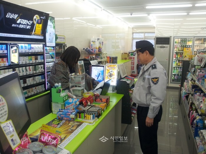 인천 중부경찰서 하인천지구대 직원이 최근 회식·송년회 등이 자주 있는 연말을 맞아 지구대에서 실시 중인 '특별방범활동'으로 현금다액취급업소 및 범죄취약지 가운데 하나인 편의점을 방문해 방범진단과 관련 내용을 안내하고 있다. (사진제공=중부경찰서)